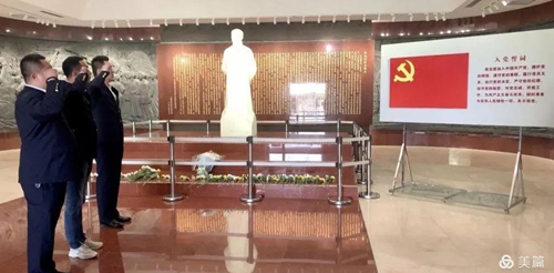 當大家踏上象征李大釗革命生涯的38級臺階,走進紀念館,步入威嚴、莊重的紀念館大廳,在李大釗塑像前整齊列隊、莊嚴肅立,集體默哀深深鞠躬,表達緬懷和敬意。之后,面對鮮紅的黨旗,唐山公交基層黨支部書記帶領兩名預備黨員緊握右拳,莊嚴宣誓。支部黨員干部集體重溫了入黨誓詞,在誓言中共同表達了對共產黨的無比忠誠和對革命精神的無比敬佩。