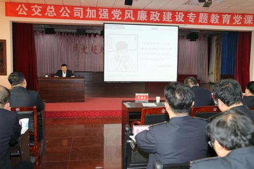 為切實(shí)履行黨委黨風(fēng)廉政建設(shè)主體責(zé)任,提高各級(jí)黨員干部的拒腐防變意識(shí),總公司黨委于3月25日在丁家屯車場(chǎng)會(huì)議室進(jìn)行了題為“加強(qiáng)黨風(fēng)廉政建設(shè),推進(jìn)唐山公交健康有序和諧發(fā)展”的廉政教育專題黨課,由黨委書(shū)記、副總經(jīng)理夏保良主講??偣救w班子成員、中層干部以及所屬各單位科隊(duì)長(zhǎng)以上干部,計(jì)三百余人接受了廉政教育。黨課由黨委副書(shū)記、紀(jì)委書(shū)記客林榮主持。